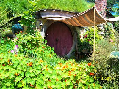 Well, I think I would be more shocked to know that any of you were *not* on pins and needles eagerly anticipating The Hobbit's theatrical release this December. So here's a sneak peek for you. I know a gal named Kate Malone (that's her walking by Frodo in the picture above) who was incredibly lucky to be cast as an extra on the set. She took some pictures of Hobbiton after shooting was done there, and just recently got the green-light to share the images. Thank you, Kate, for letting me share them here!